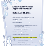 Cross Country Cruiser Appreciation Dinner Date: April 18, 2026 Norwood Pines Time: 5:00pm Cocktails 6:30 Dinner Plated Dinner Choices: 1. Bourbon Glazed Pork Ribeye…