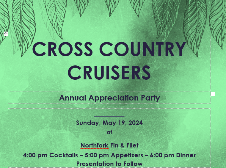 All Members are invited, if members volunteered two (2) times during the season your meal and two (2) Drink tickets will be paid by the Cruisers. If you would like to attend and did not volunteer, the cost will be $35 per person. Please click the link below for the invite, remember to RSVP…
